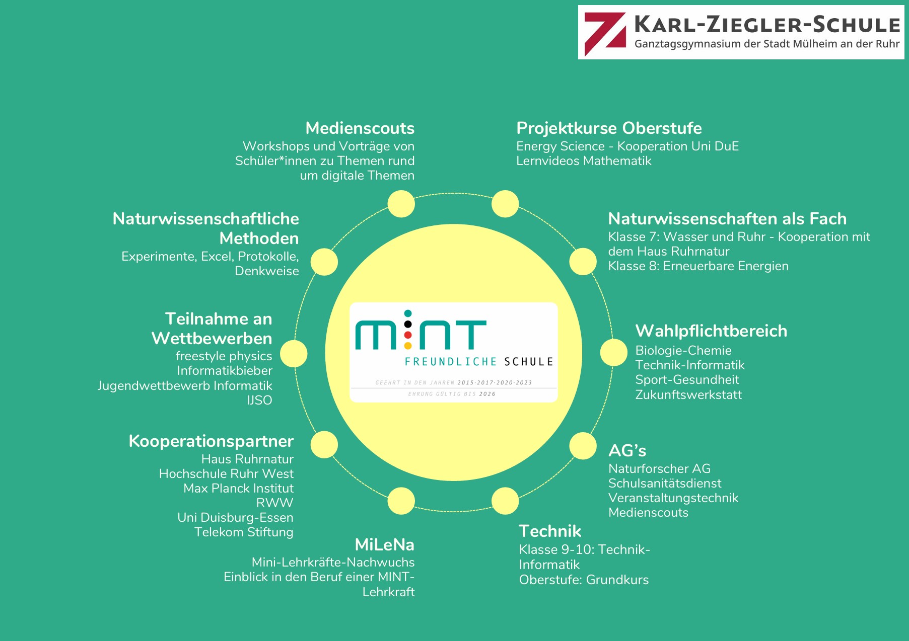 Du interessierst dich für naturwissenschaftliche Fächer? Dann bist du an der Karl-Ziegler-Schule genau richtig! Bereits seit Jahren halten wir die Auszeichnung als MINT-freundliche Schule. Dieses Gütesiegel der nationalen Initiative „MINT Zukunft schaffen!“ bestätigt unser Engagement in den Bereichen Mathematik, Informatik, Naturwissenschaften und Technik (MINT) – ganz unserem Namensgeber entsprechend. Karl Ziegler war einer der bekanntesten Wissenschaftler Mülheims. 1963 erhielt er gemeinsam mit Giulio Natta den Nobelpreis für Chemie für die Entwicklung der Ziegler-Natta-Katalysatoren, die die Herstellung neuer Kunststoffe ermöglichten.