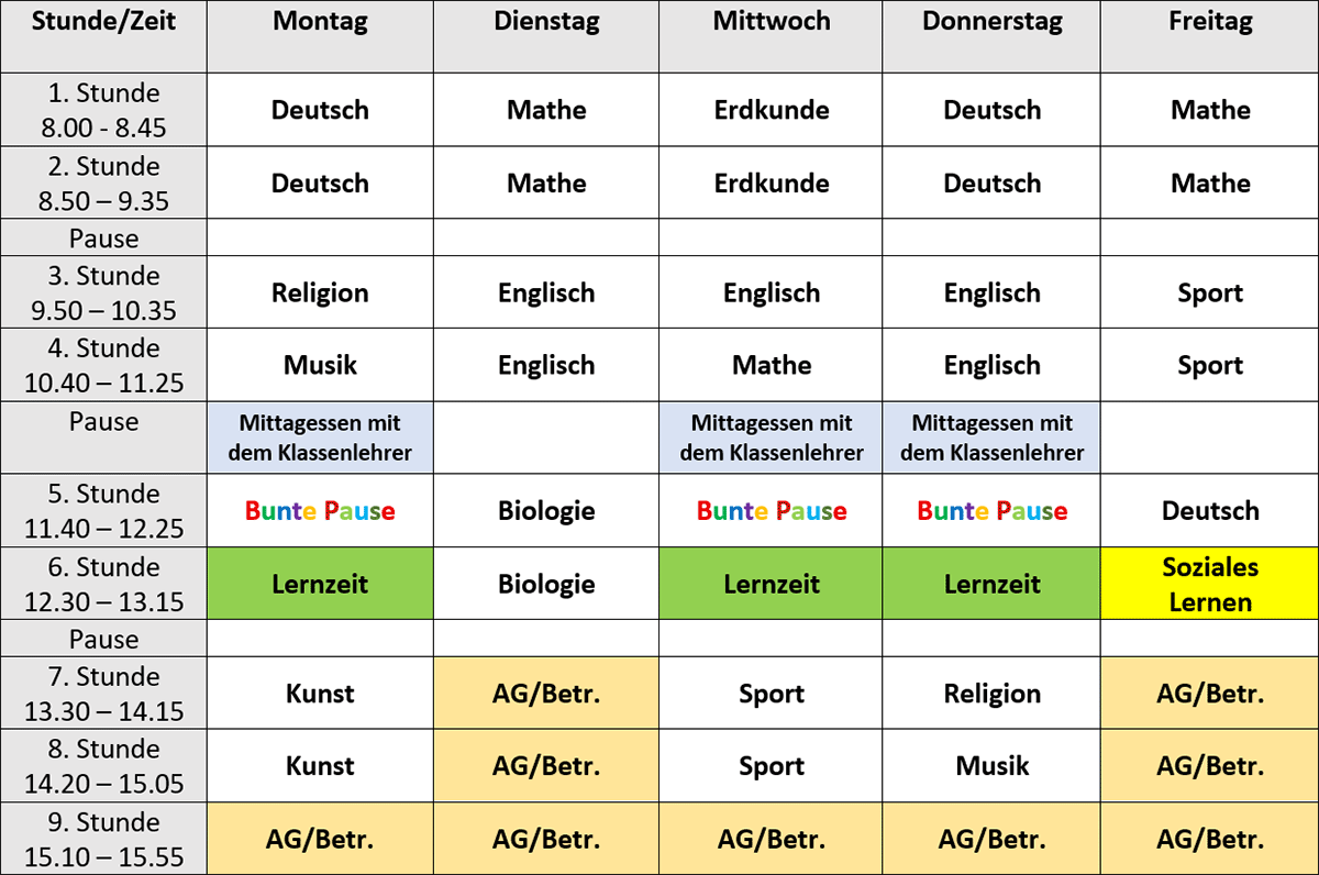 Um effiziente Lernzeit zu ermöglichen, wird an der Karl-Ziegler-Schule möglichst in Doppelstunden unterrichtet. Der Beispiel-Stundenplan zeigt die Fächer, die im 5. Jahrgang unterrichtet werden. Im 6. Schuljahr kommen die Fächer Informatik, Wirtschaft /Politik, Physik und Geschichte hinzu.